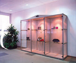 zu stellen, sondern die auszustellenden Gegenstände. Dennoch verleiht dieses Vitrinensystem Ihren Ausstellungsräumen eine ganz eigene Eleganz durch die Kombination von Glas und naturfarben-eloxiertem Aluminium. |